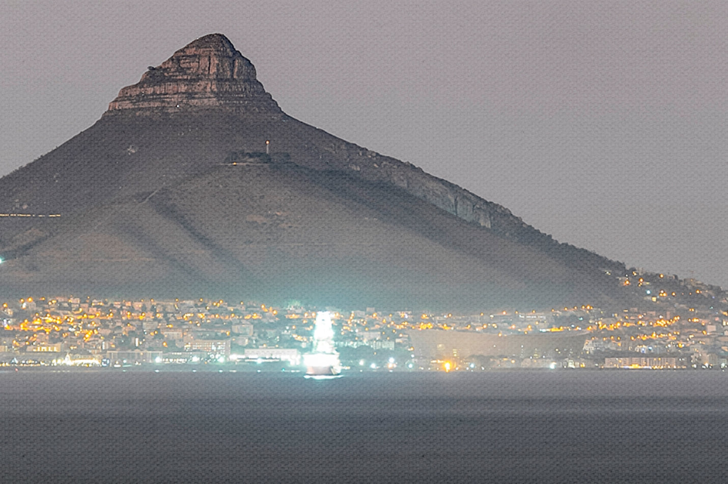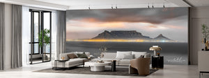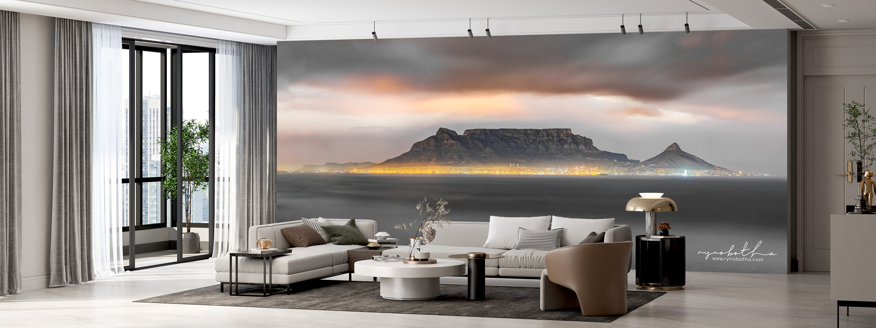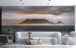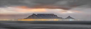 Table Mountain Twilight city lights Seascape with dramatic silky clouds. South Africa. This print can be printed 6 x 2.4 meters. For international orders, we ship prints rolled in tubes, so please send me an inquiry via email with your address and print of choice.
