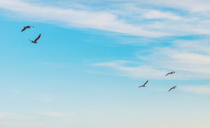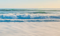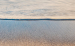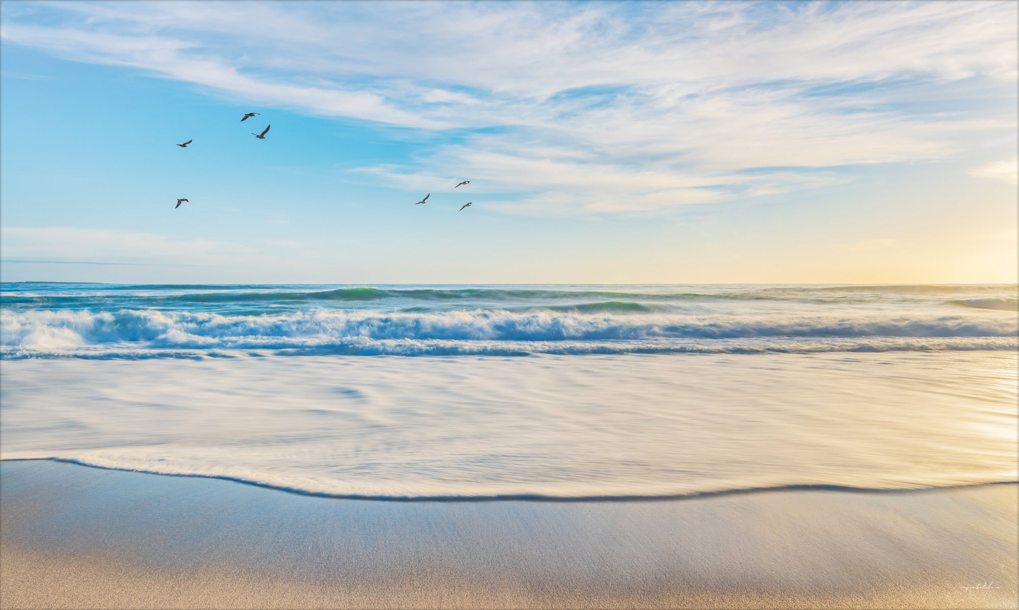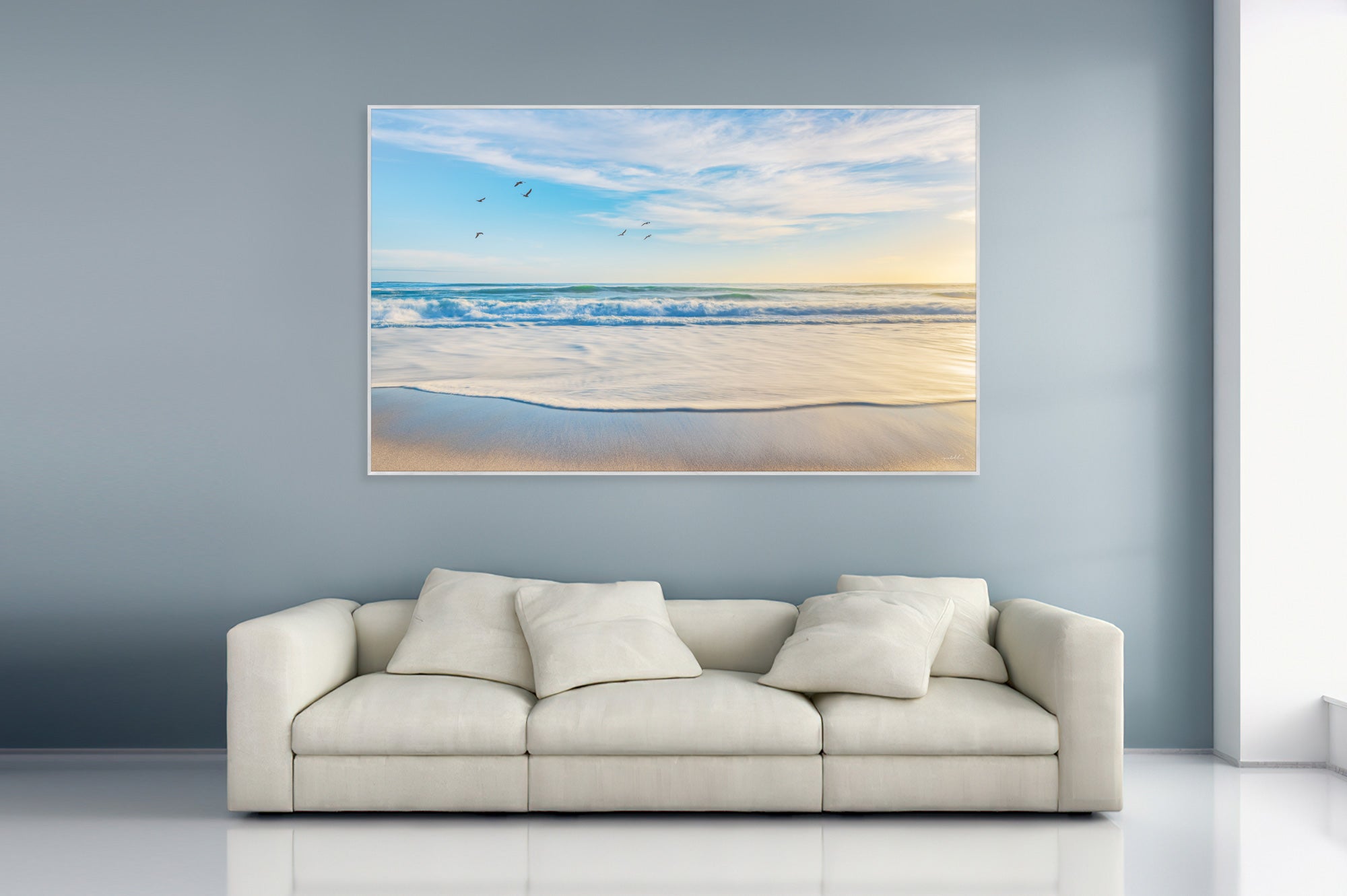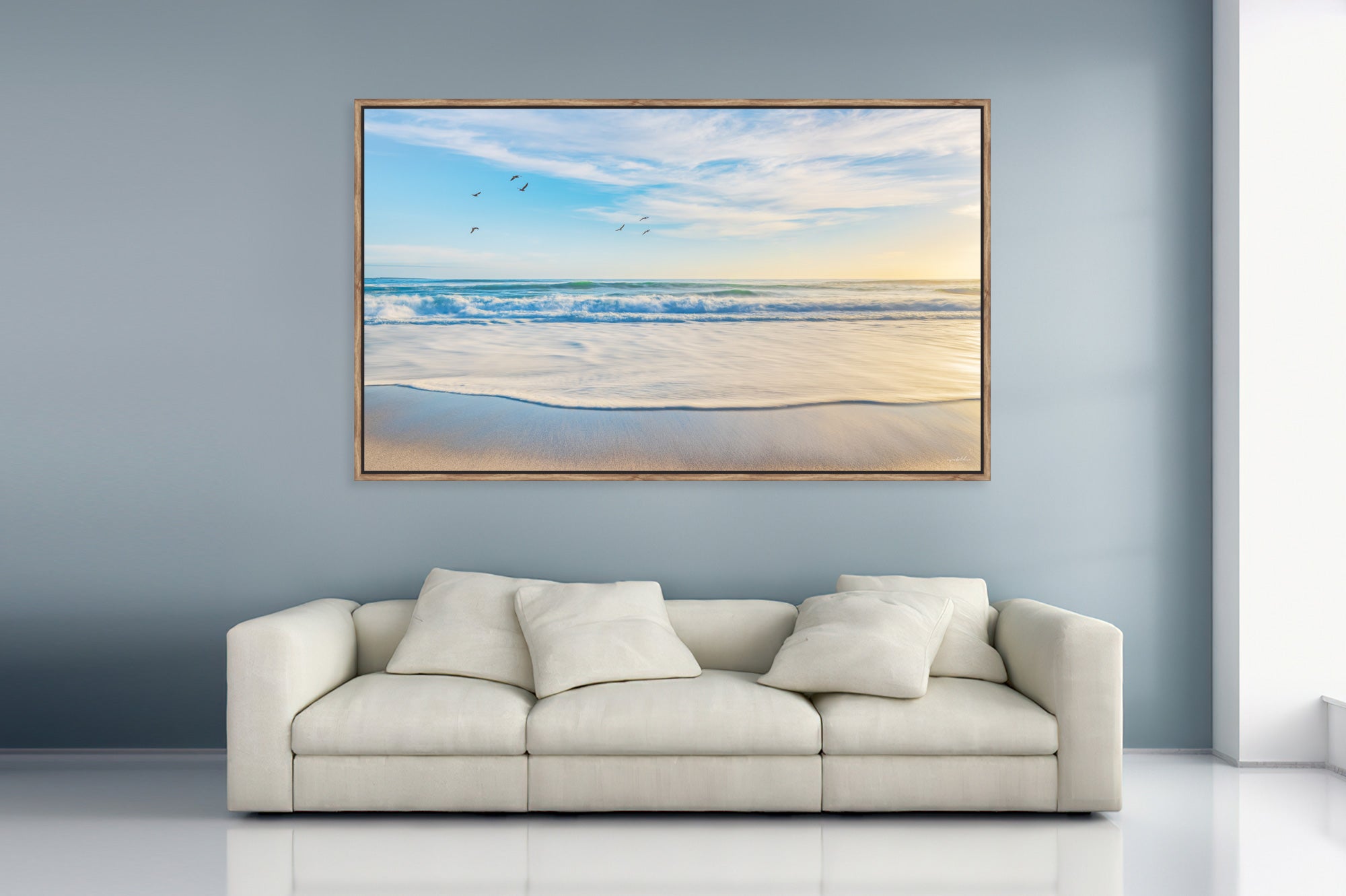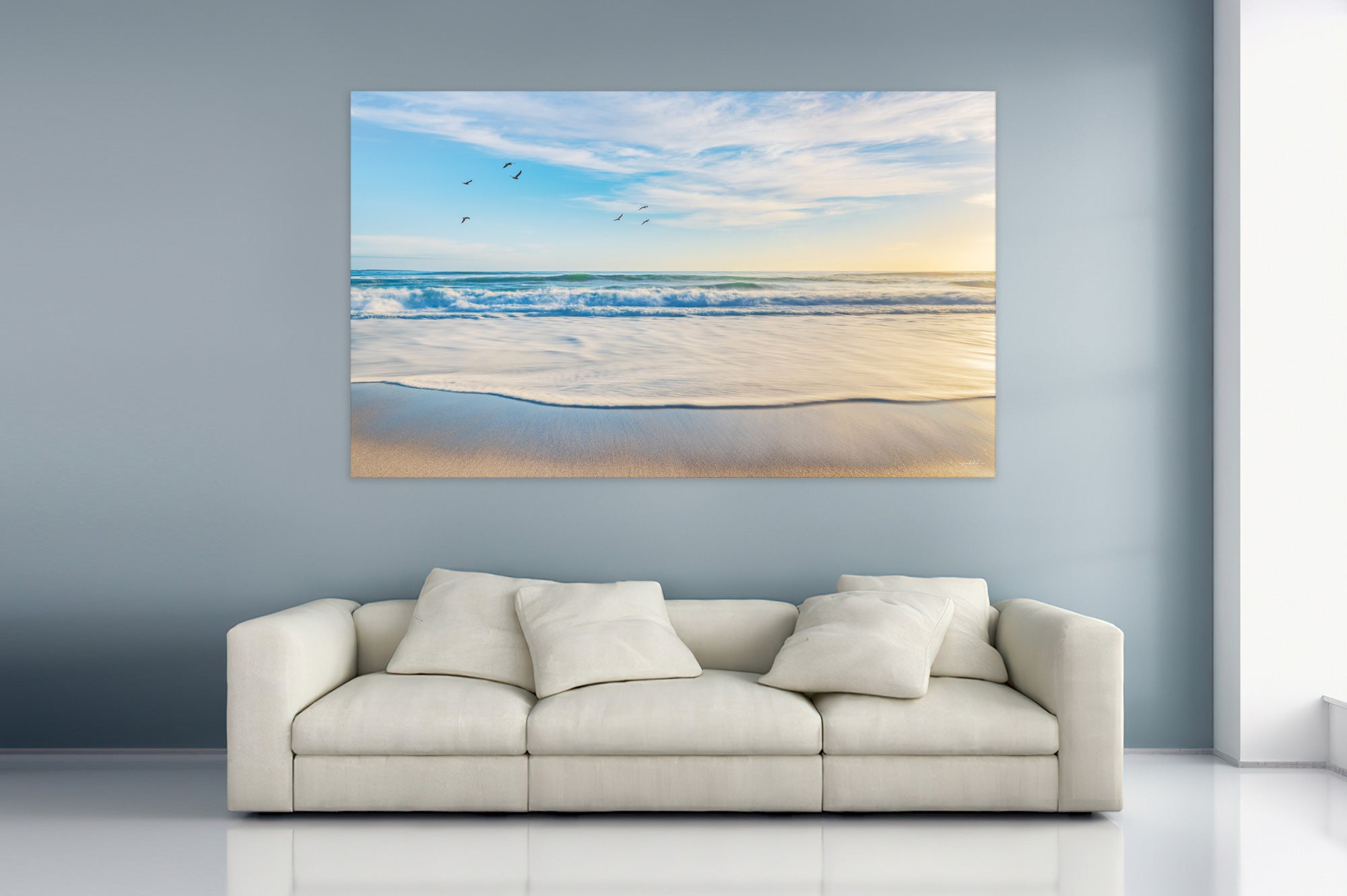Pastel seascape light yellow sunset on beach sand and birds flying, golden sands, and blue cloudy sky. For international orders, we ship prints rolled in tubes, so please send me an inquiry via email with your address and print of choice.