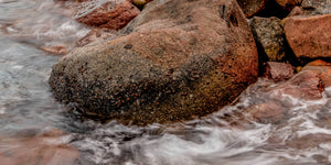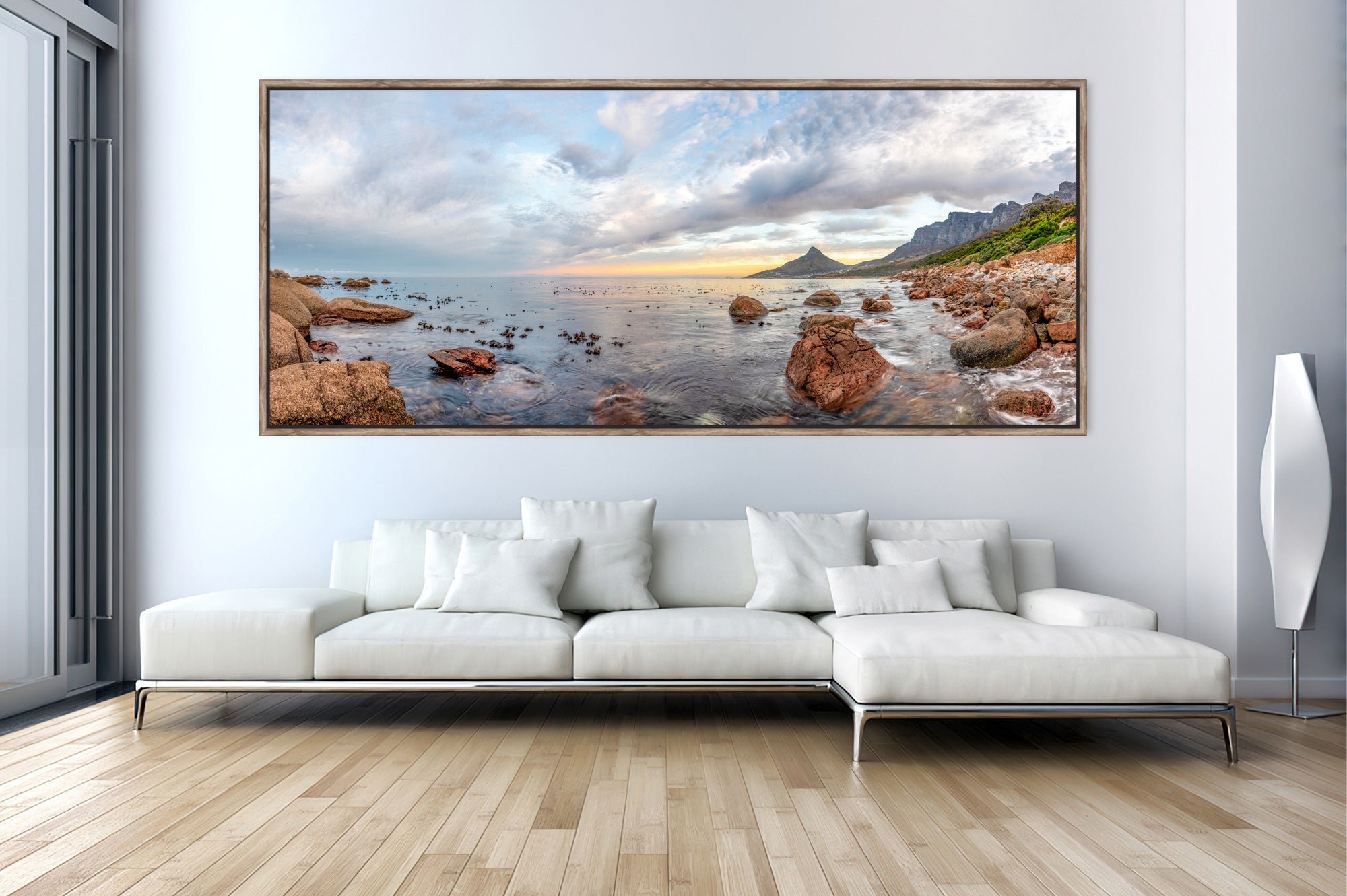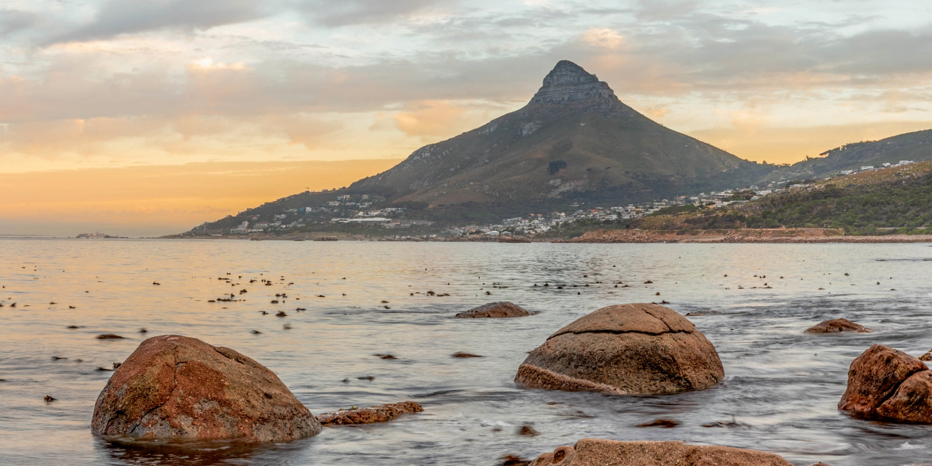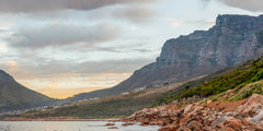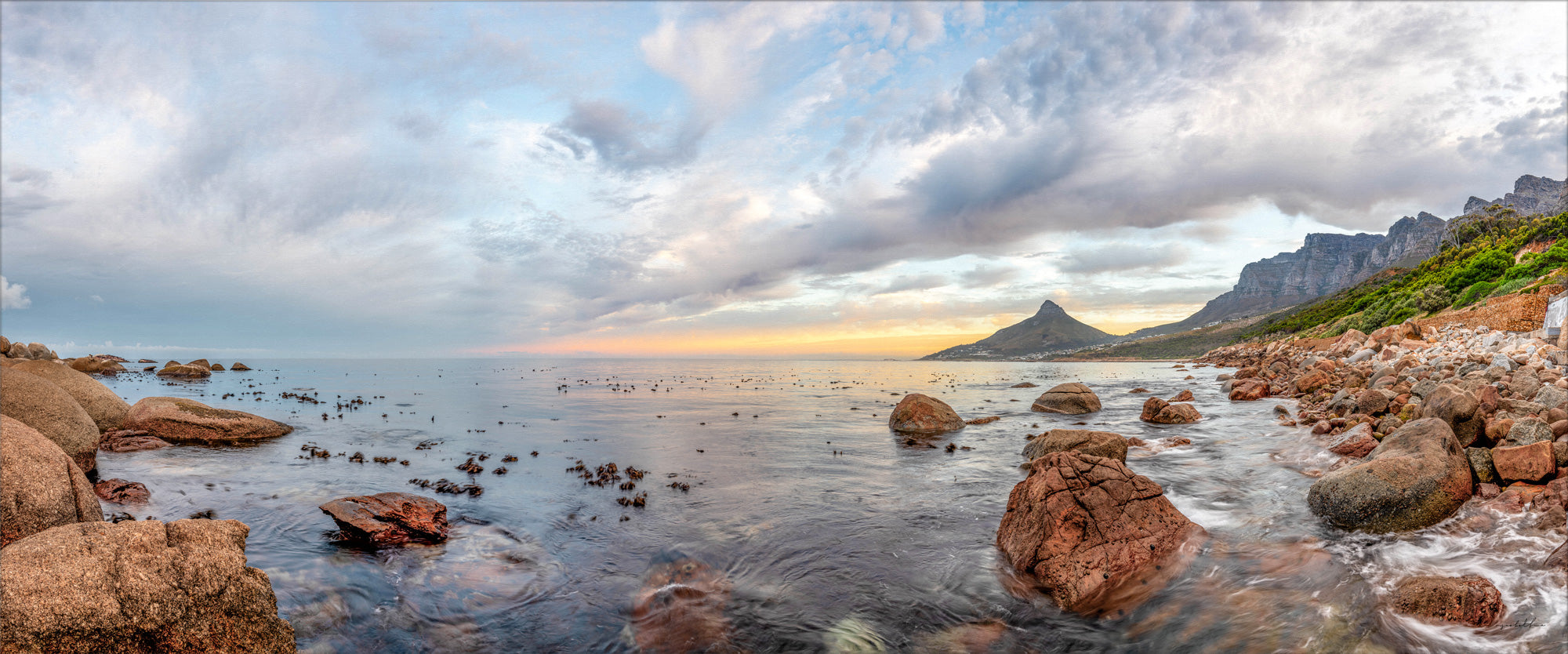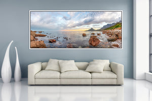 Vibrant and colorful seascape sunrise with kelp, rocks, and dramatic blue cloudy sky. Cape Town Lions Head, South Africa For international orders, we ship prints rolled in tubes, so please send me an inquiry via email with your address and print of choice.