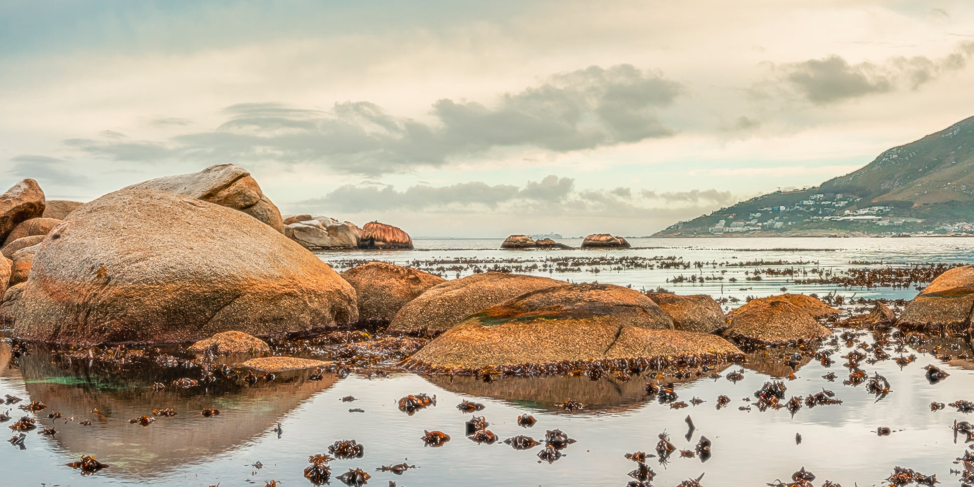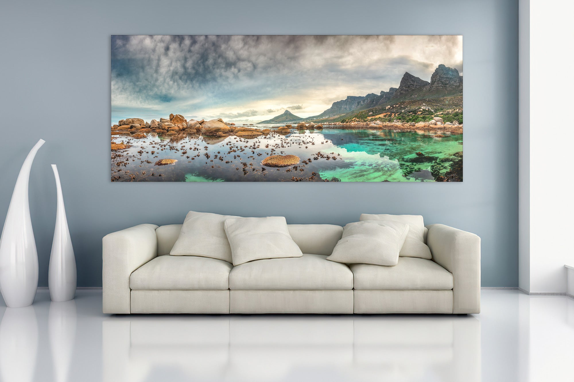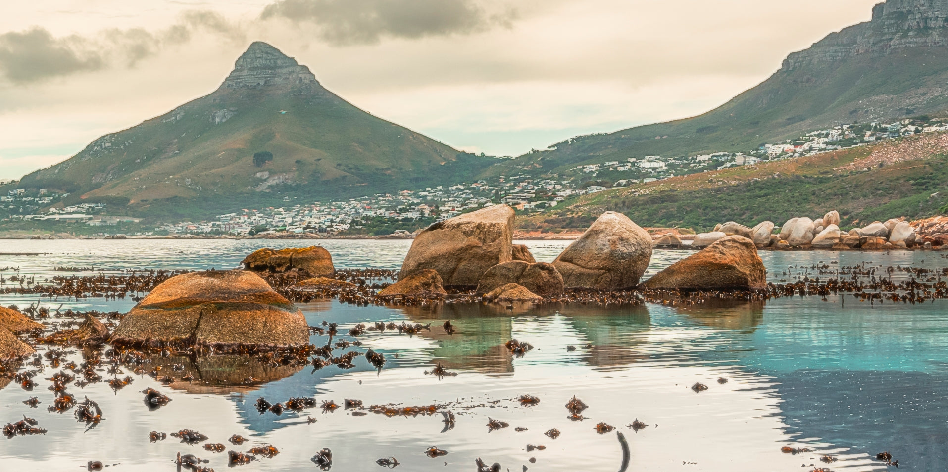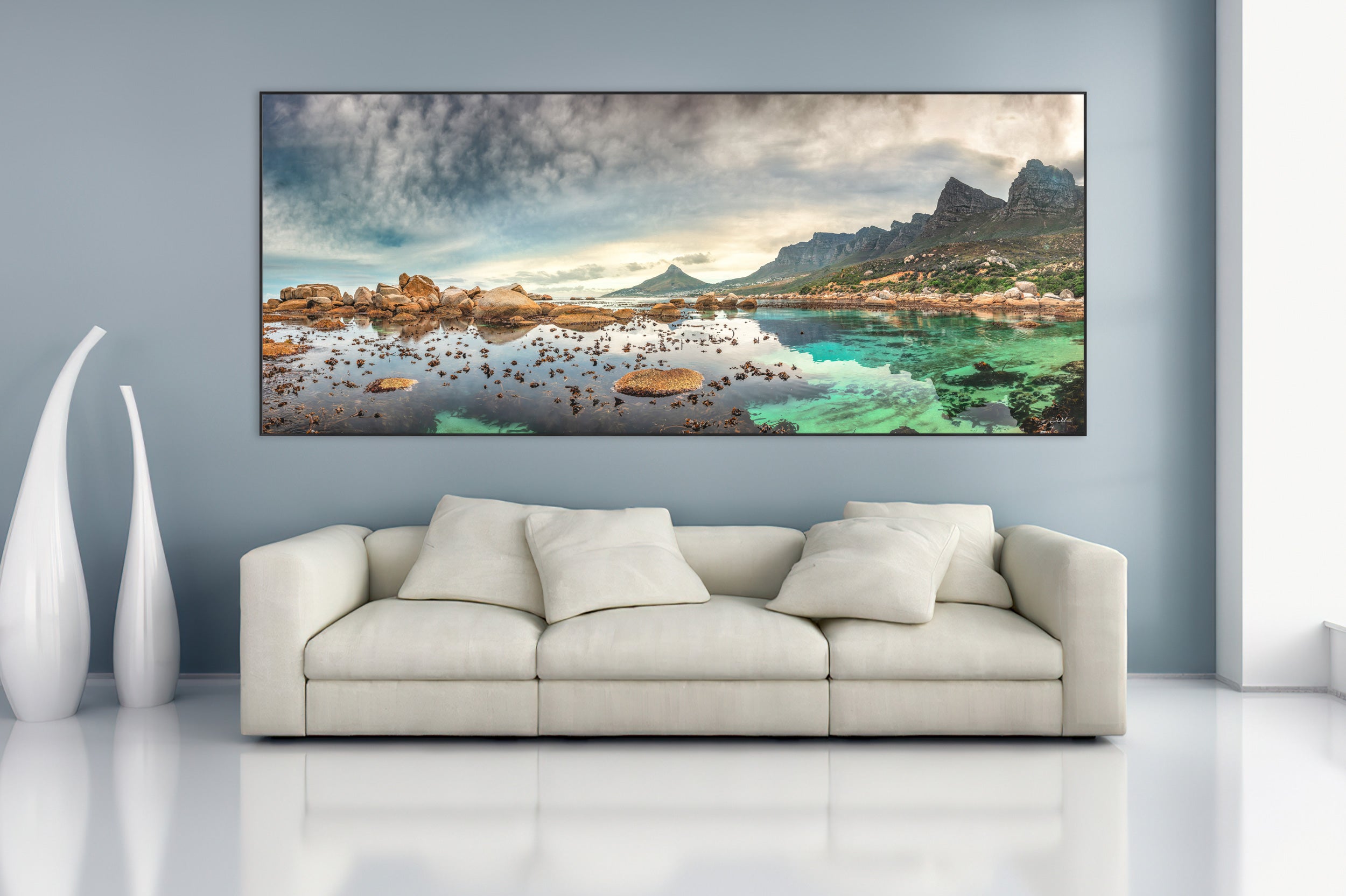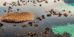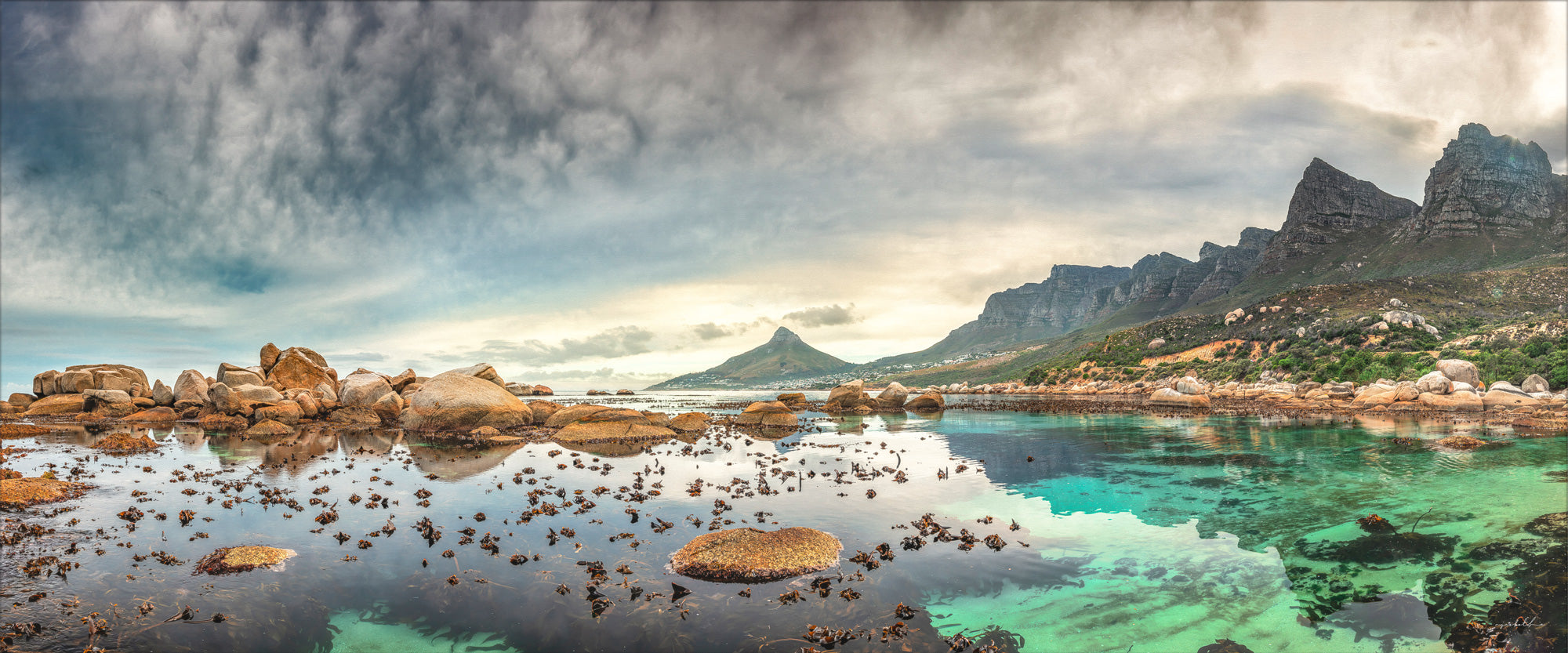 Vibrant and colorful seascape sunrise with kelp, rocks, and dramatic blue cloudy sky. Cape Town Lions Head, South Africa. For international orders, we ship prints rolled in tubes, so please send me an inquiry via email with your address and print of choice.