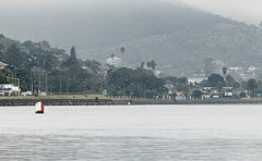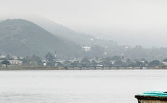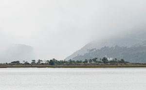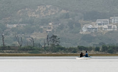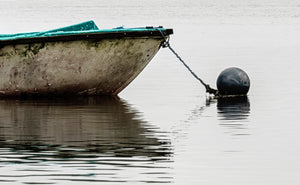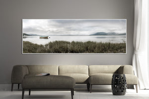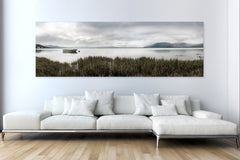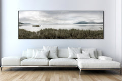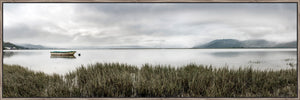 Soft pastel-colored Serene misty morning on Knysna Lagoon (lake) with a rowboat. For international orders, we ship prints rolled in tubes, so please send me an inquiry via email with your address and print of choice.