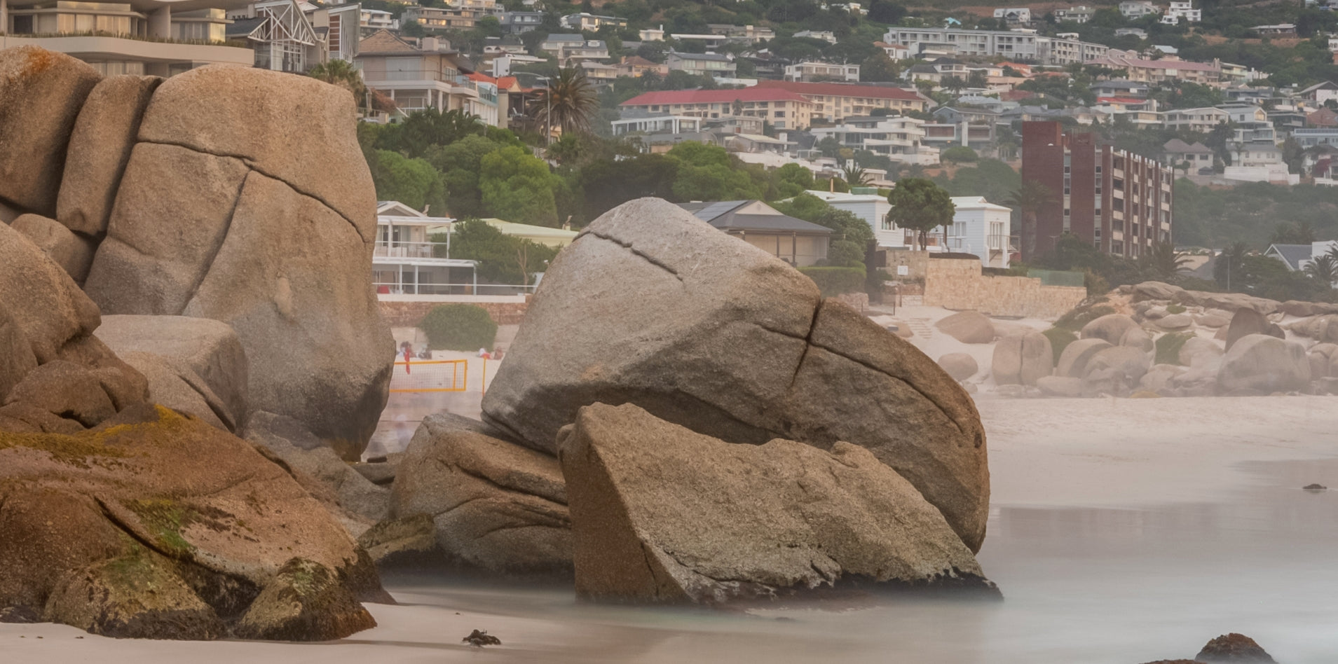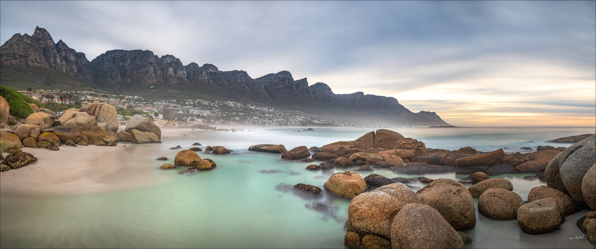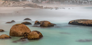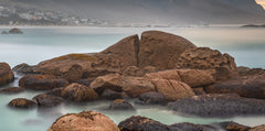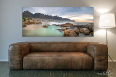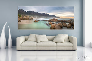 Vibrant and colorful seascape sunset in South Africa Camps Bay, rocks and dramatic blue cloudy sky. For international orders, we ship prints rolled in tubes, so please send me an inquiry via email with your address and print of choice.
