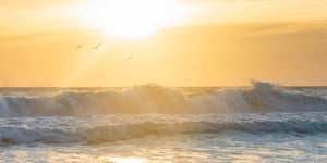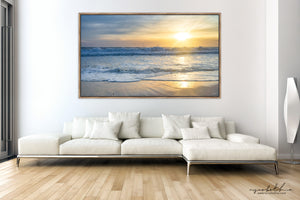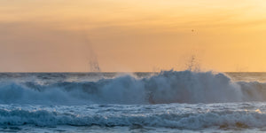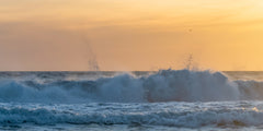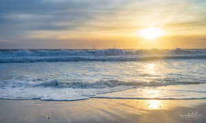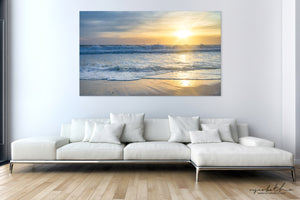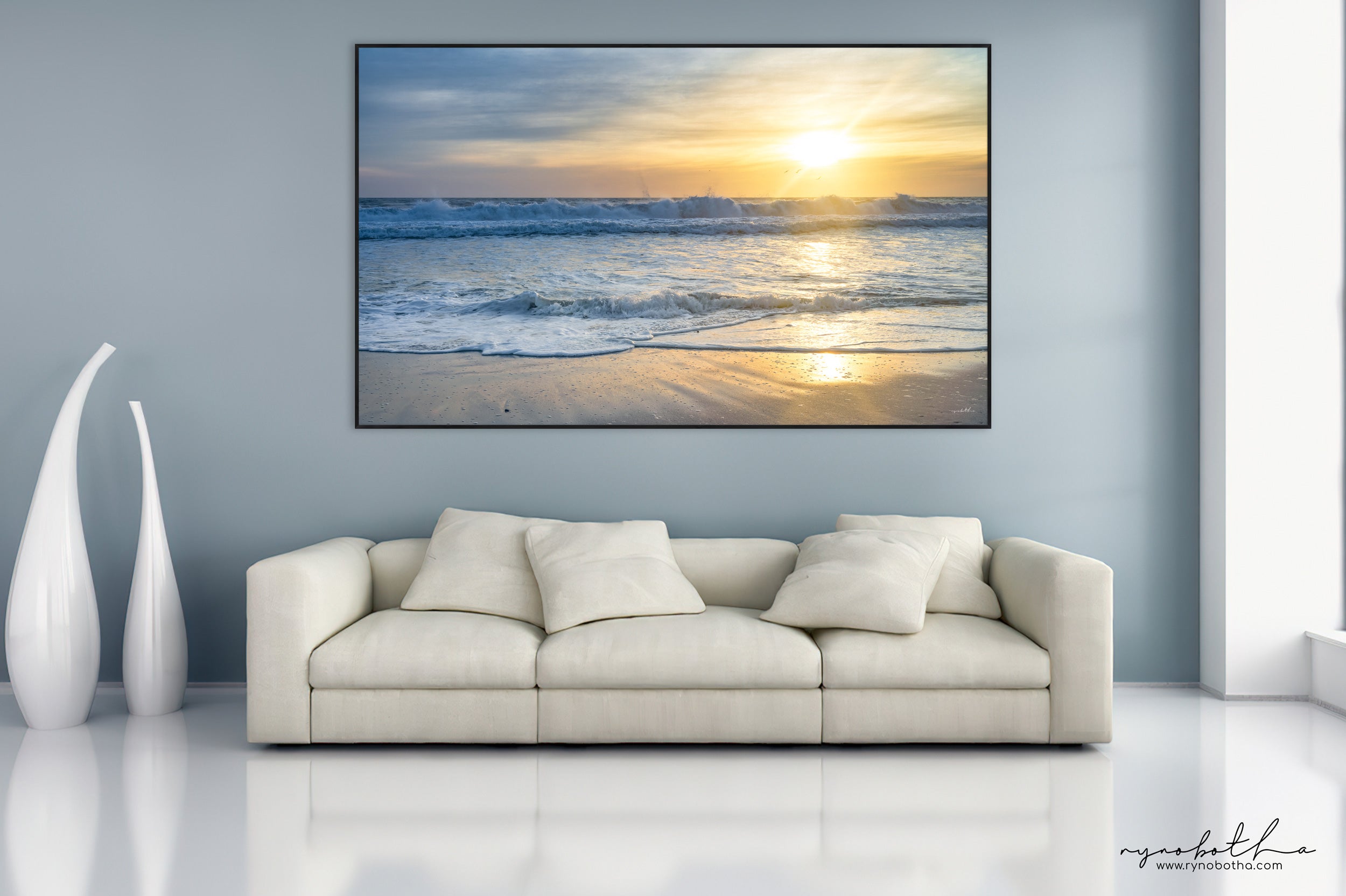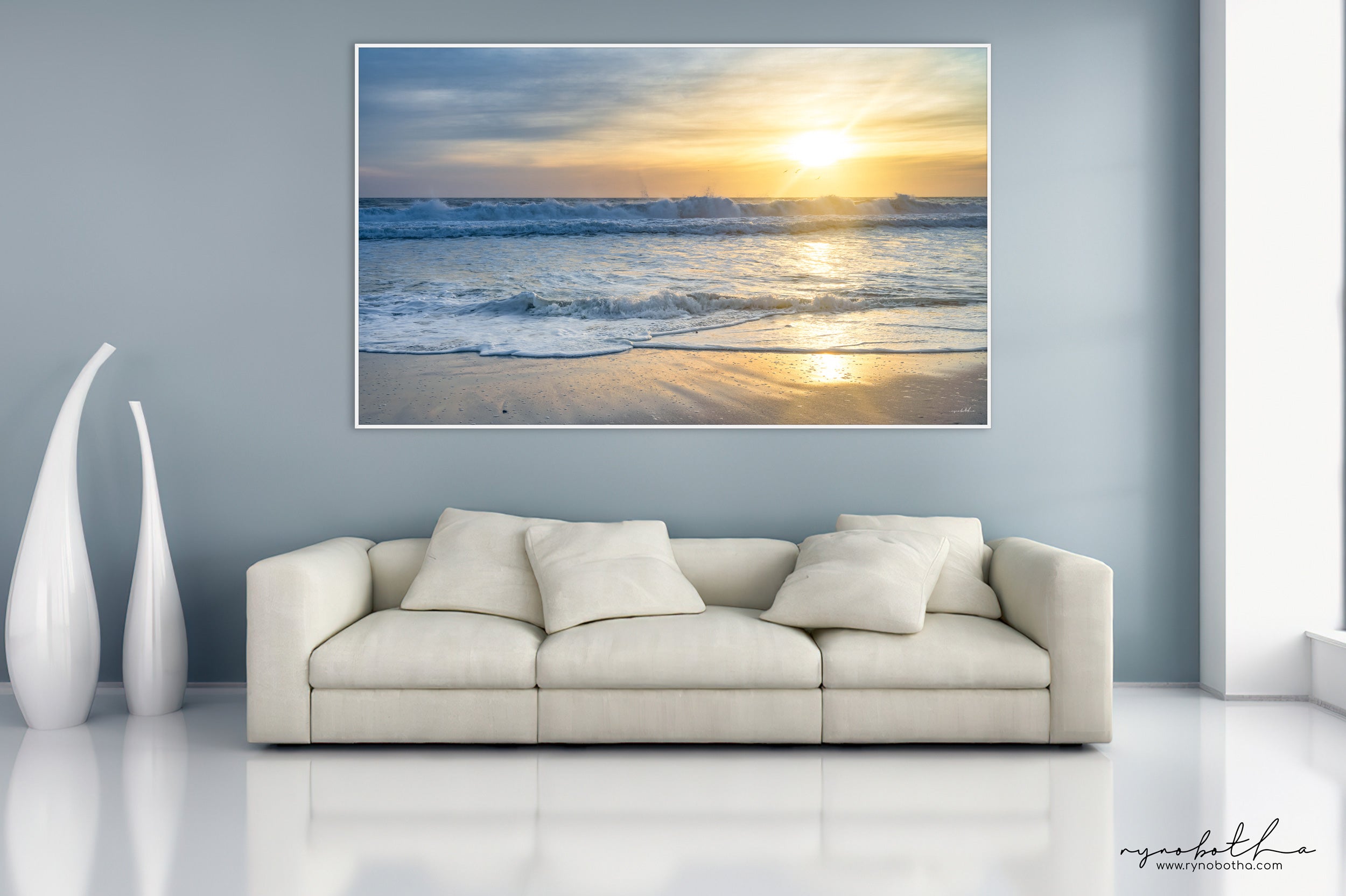 Cape Town South Africa, Vibrant and colorful landscape Seafront Sunset with a Golden yellow sun, golden sun reflection on water and blue sky. Water rushing, dramatic sky low point of view. For international orders, we ship prints rolled in tubes, so please send me an inquiry via email with your address and print of choice.
