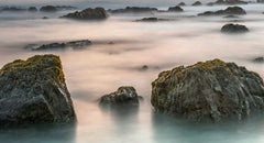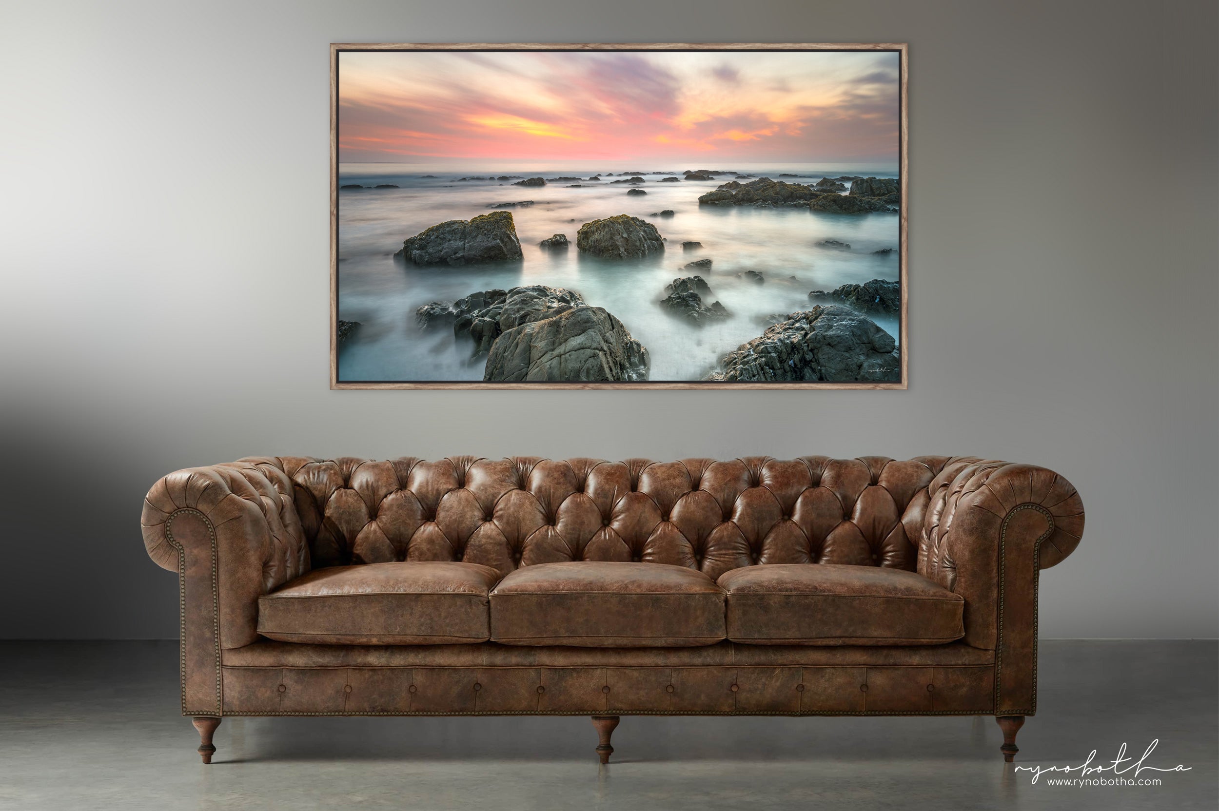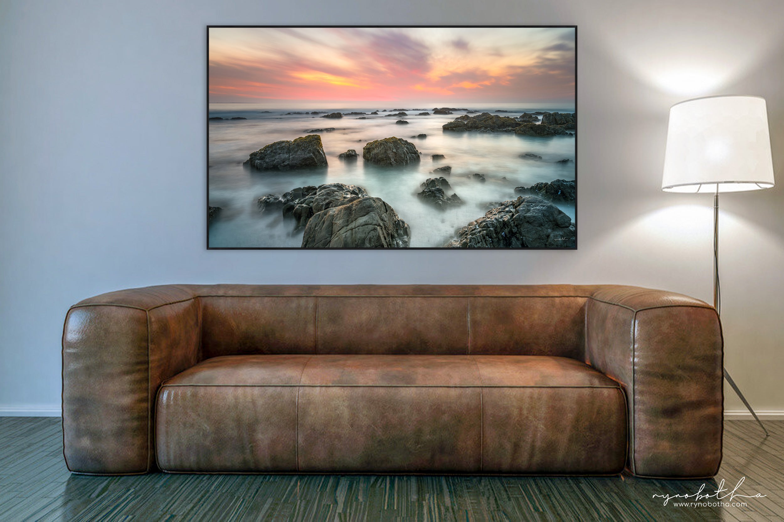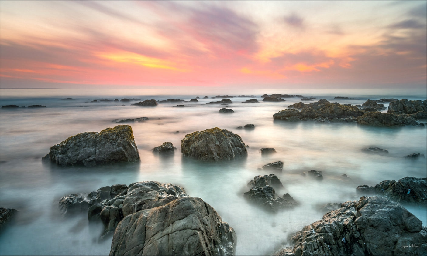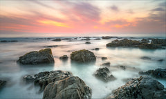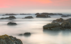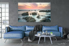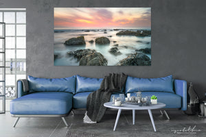 Long exposure seascape of a tranquil, rocky sunset scene with soft pastel tones. For international orders, we ship prints rolled in tubes, so please send me an inquiry via email with your address and print of choice. Oversized Large Jumbo Prints