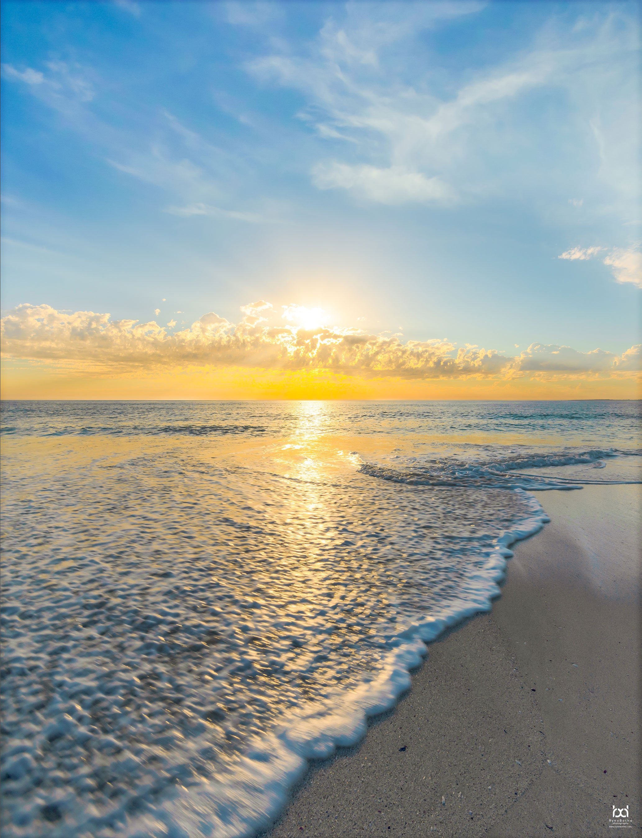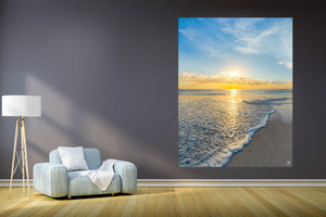Vibrant and colorful landscape Seafront Sunset with Golden yellow sun, golden sun reflection on water and blue sky. Water rushing, dramatic sky low point of view. For international orders, we ship prints rolled in tubes, so please send me an inquiry via email with your address and print of choice.