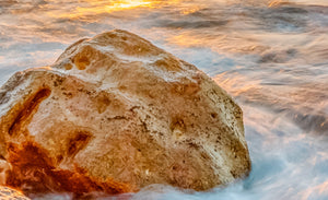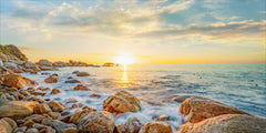 Vibrant colorful landscape Seafront, large rocks & Sunset with soft yellow / blue sky, beautiful day. Water rushing. For international orders, we ship prints rolled in tubes, so please send me an inquiry via email with your address and print of choice.