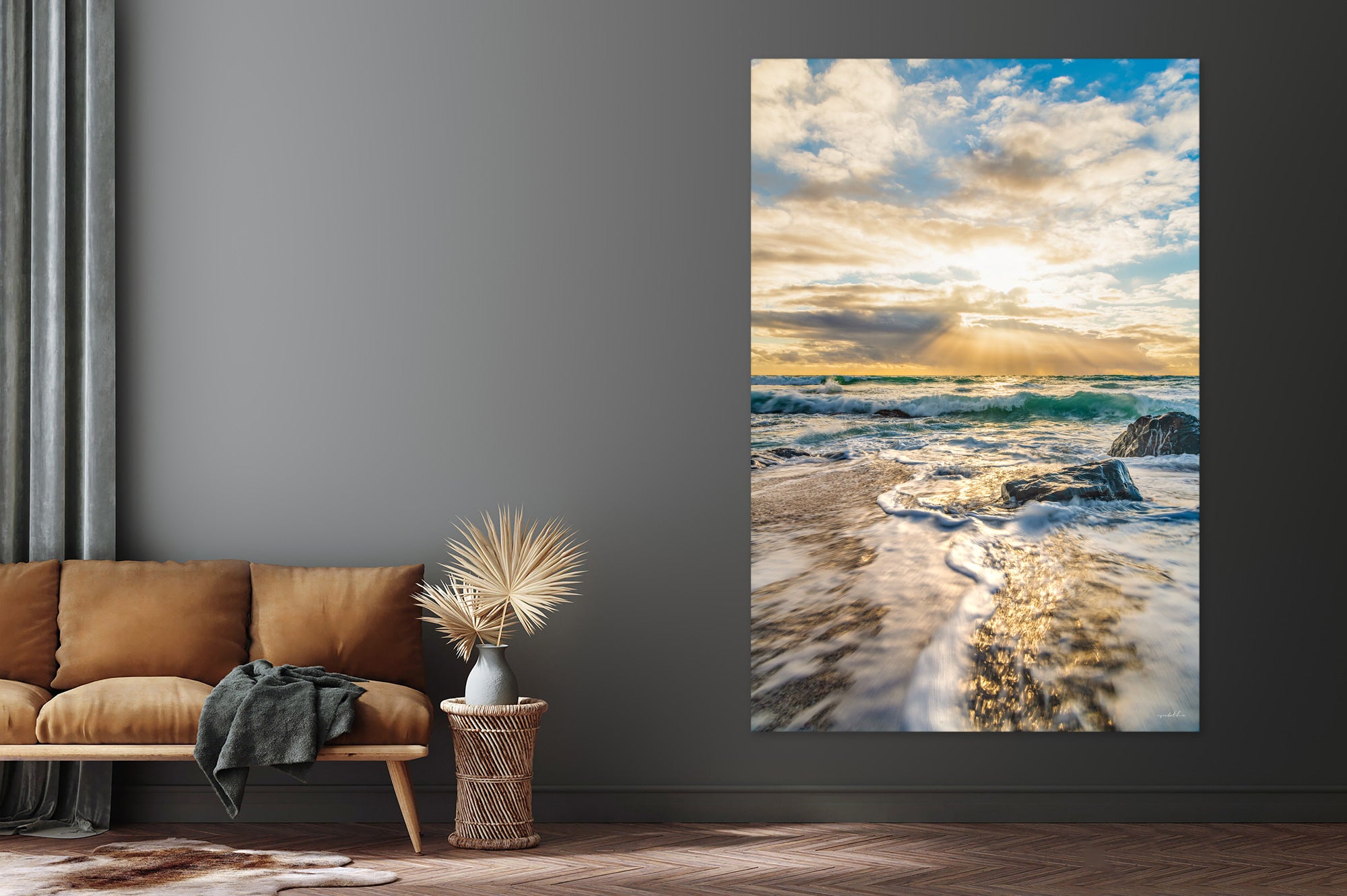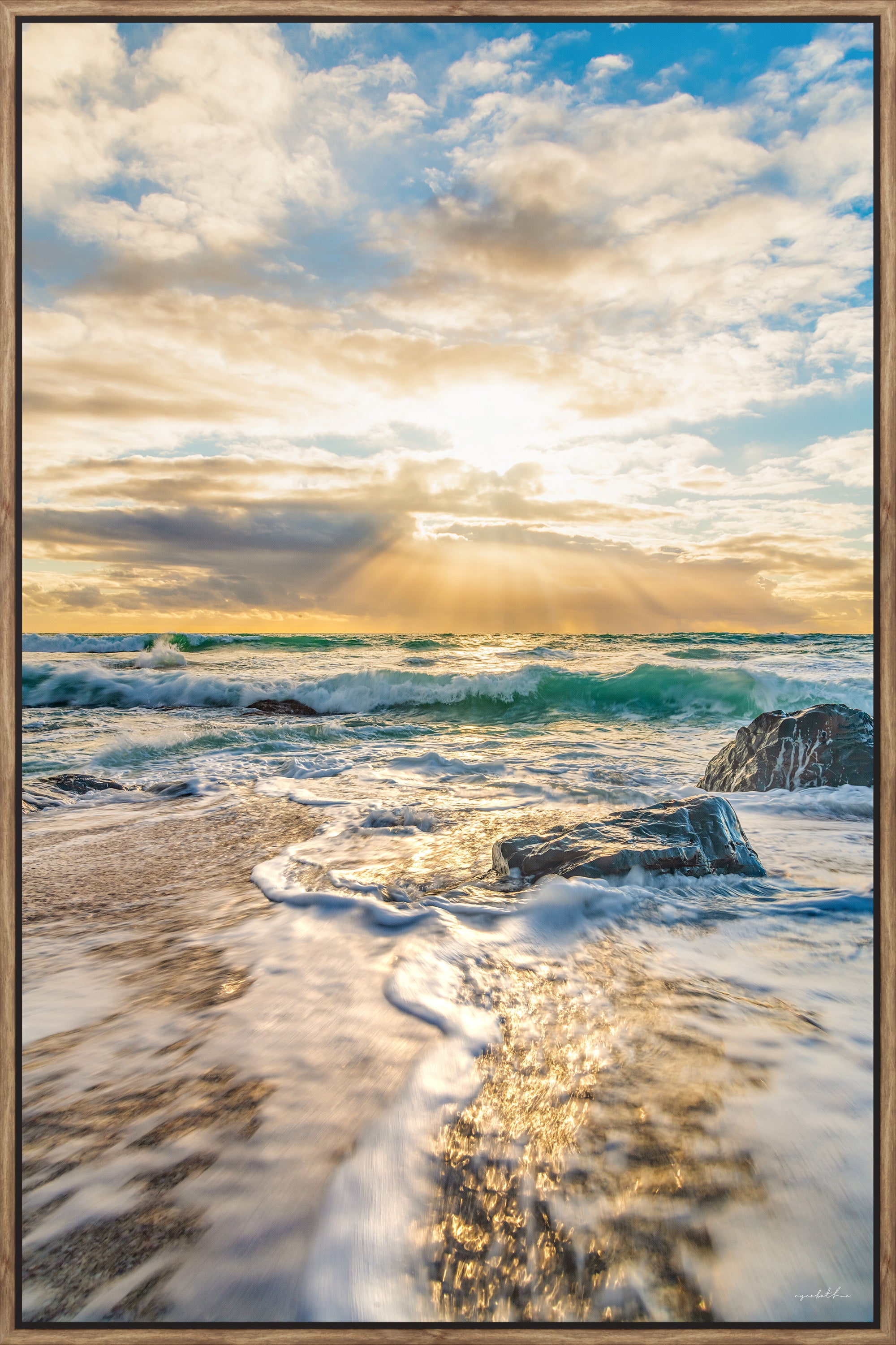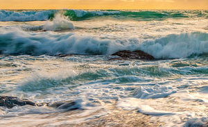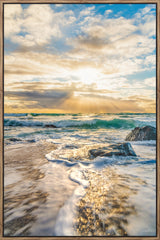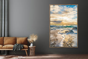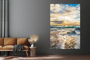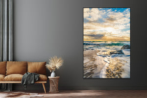 Vibrant and colorful seascape sunset with golden yellow sun and Moody blue sky, perfect sun star, beautiful evening. Water rushing and dramatic sky. For international orders, we ship prints rolled in tubes, so please send me an inquiry via email with your address and print of choice.